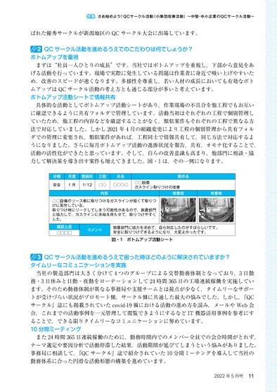 特集さあ始めよう!QCサークル活動(小集団改善活動)〜中堅・中小企業のQCサークル活動〜ばれた優秀サークルが新潟地区のQCサークル大会に出場しています。2QCサークル活動を進めるうえでのこだわりは何でしょうか?ボトムアップを重視まずは“社員一人ひとりの成長”です。当社ではボトムアップを重視し,下部から意見をあげる活動を行っています。現場で実際に発生している問題は作業者に身近で吸い上げやすいため,改善のスピードが速くなります。多様性を尊重し,若い人材の成長においても有効なボトムアップはQCサークル活動の考え方とも通じる部分が多いと考えています。ボトムアップ活動シートで情報共有具体的な活動としてボトムアップ活動シートがあり,作業現場の不具合を他工程でもお互いに確認できるように共有フォルダで管理しています。活動当初はそれぞれの工程で個別管理していたため,他工程の内容などを確認することがなく,類似案件もそれぞれの工程で異なる方法で対応していました。しかし2021年4月の組織変更により工程の個別管理から共有フォルダでの管理に変更され,類似案件があれば,工程同士で情報共有して,同じ方法で対応するようになりました。さらに毎月ボトムアップ活動の進捗状況を報告,共有,オモテ化することで,活動の活性化ができたと思っています。そして,自らの改善意識も高まり,他部門に相談・協力して解決策を導き出す案件も増えてきました。図・1は,その一例になります。分類安全月度1月登録日1/12氏名○○○○工程○○内容案件名○○設備ガスライン取りつけの改善改善前改善後○○設備のソース側に取りつけるガスラインが短くて取りつけに苦労している。取りつけ時にリークしてしまう可能性があるので,装置部門と協力して,ガスラインに余裕を持たせて,取りつけやすくした。確認上長□□□□コメント装置部門に協力を求めて,自ら対応したのがすばらしいです。安全に取りつけできるようになり,大変よかったです。図・1ボトムアップ活動シート3QCサークル活動を進めるうえで困った時はどのように解決されていますか?タイムリーなコミュニケーションを実施当社の製造部門は大きく分けて4つのグループによる交替勤務体制となっており,3日勤務・3日休みと日勤・夜勤をローテーションして24時間365日の工場連続稼働を実施しています。そのため勤務体制が異なる事務局や支援チームとは接点が少なく,タイムリーなサポートが受けづらい状況がプロモート側,サークル側に共通した最大の悩みでした。しかし,『QCサークル』誌にも掲載されていたcovid-19禍における活動の進め方を読み,メールやWeb会合,これまでの活動事例を一元管理して閲覧できようにするなどIT機器活用事例を参考にすることで,できる限りタイムリーなコミュニケーションに努めています。10分間ミーティングまた24時間365日連続稼働のために,勤務時間内でのメンバー全員での会合時間がとれず,テーマ選定や要因分析で活動停滞した結果,活動期間が延びてしまうという悩みがありました。事務局に相談して,『QCサークル』誌で紹介されていた10分間ミーテングを導入して当社の勤務体系に合った円滑な活動形態の構築を進めています。2022年5月号11