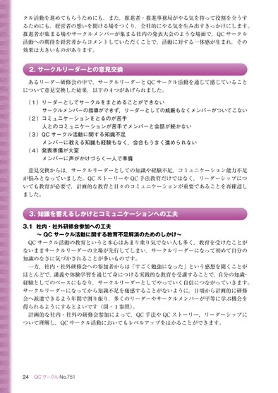クル活動を進めてもらうためにも,また,推進者・推進事務局がやる気を持って役割を全うするためにも,経営者の想いを聞ける場をつくり,全社的にやる気を生み出すきっかけにします。推進者が集まる場やサークルメンバーが集まる社内の発表大会のような場面で,QCサークル活動への期待を経営者からコメントしていただくことで,活動に対する一体感が生まれ,その効果は大きいものがあります。2.サークルリーダーとの意見交換あるリーダー研修会の中で,サークルリーダーとQCサークル活動を通じて感じていることについて意見交換した結果,以下の4つがあげられました。(1)リーダーとしてサークルをまとめることができないサークルメンバーの指導ができず,リーダーとしての威厳もなくメンバーがついてこない(2)コミュニケーションをとるのが苦手人とのコミュニケーションが苦手でメンバーと会話が続かない(3)QCサークル活動に関する知識不足メンバーに教える知識も経験もなく,会合もうまく進められない(4)発表準備が大変メンバーに声がかけづらく一人で準備意見交換からは,サークルリーダーとしての知識や経験不足,コミュニケーション能力不足が悩みとなっていました。QCストーリーやQC手法教育だけではなく,リーダーシップについても教育が必要で,計画的な教育と日々のコミュニケーションが重要であることを再確認しました。3.知識を蓄えるしかけとコミュニケーションへの工夫3.1社内・社外研修会参加への工夫~QCサークル活動に関する教育不足解消のためのしかけ~QCサークル活動の教育というと本心はあまり乗り気でない人も多く,教育を受けたことがないままサークルリーダーの立場が先行してしまい,サークルリーダーになって初めて自分の知識のなさに気づかされることが多いものです。一方,社内・社外研修会への参加者からは「すごく勉強になった」という感想を聞くことがほとんどで,講義や体験学習を通じて身につける実践的な教育を受講することで,自分の知識・経験としてのベースにもなり,サークルリーダーとしてやっていく自信につながっていきます。サークルリーダーになってから知識不足を痛感することがないように,日頃から計画的に研修会へ派遣できるよう年間で割り振り,多くのリーダーやサークルメンバーが平等に学ぶ機会を得られるようにするとよいです(図・1参照)。計画的な社内・社外の研修会参加によって,QC手法やQCストーリー,リーダーシップについて理解し,QCサークル活動においてもレベルアップをはかることができます。24QCサークルNo.751